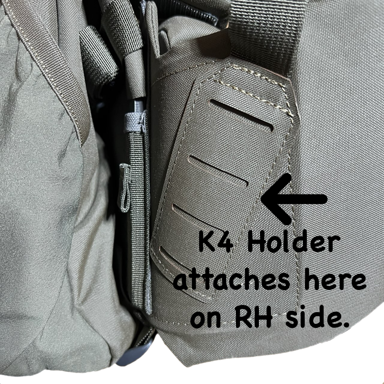 * This Model only fits the EXO K4 Backpack. EX) K4 Bugle Tube V2/ Water Bottle Holder (Adjustable) is the easy way to carry your Bugle Tube or Water Bottle. The V2 has an adjustable tension system and you can install your Bugle Tube from the top. This K4 model only installs on the right hand side of your K4 backpack. Water bottle installs from the top and is secured by webbing with a locking clip. The V2 holds 24, 32, 40 ounce bottles. The single clip attached to the back of the holder that will attach to your Backpack hip belt Molle system on your backpack.